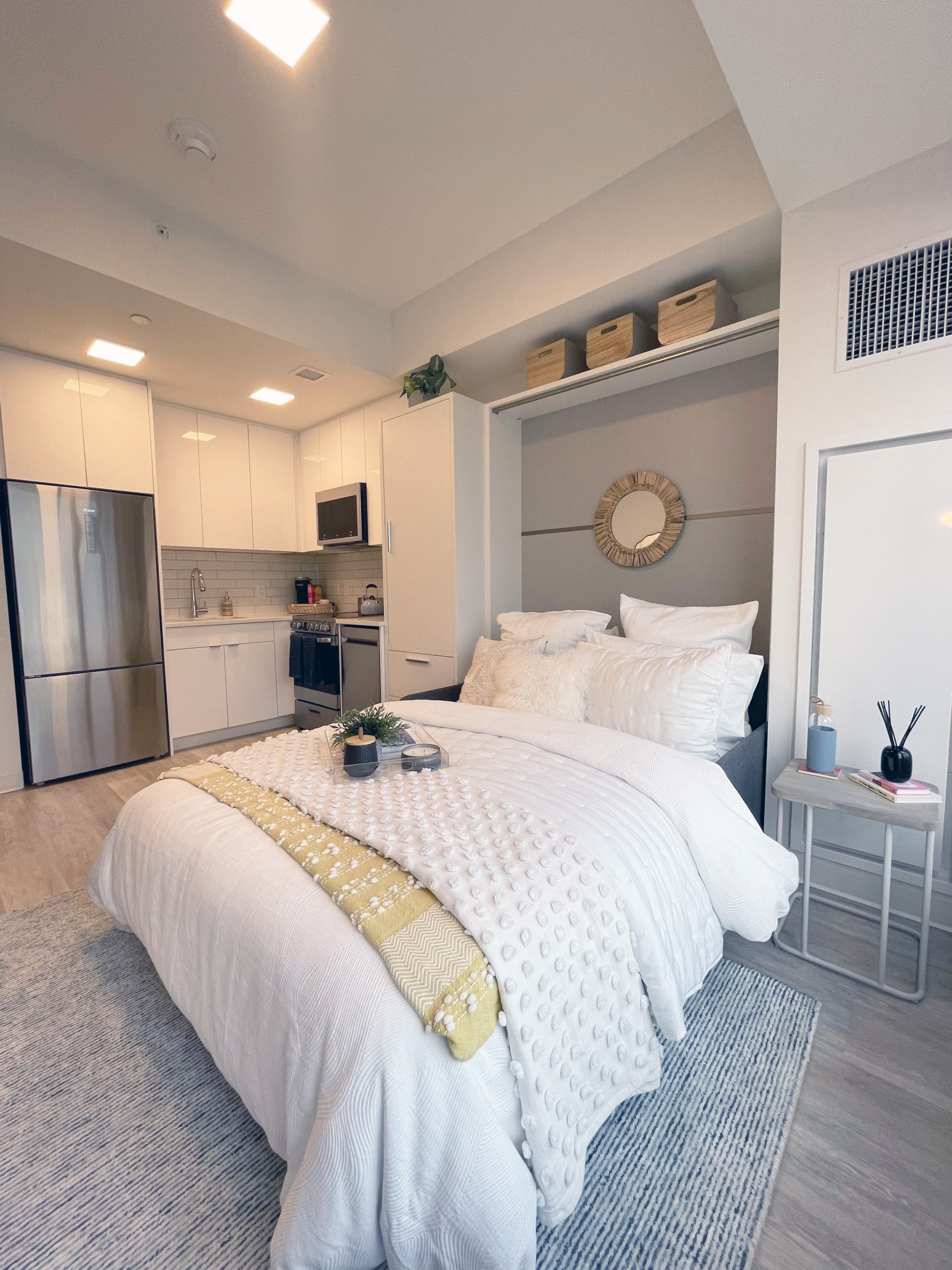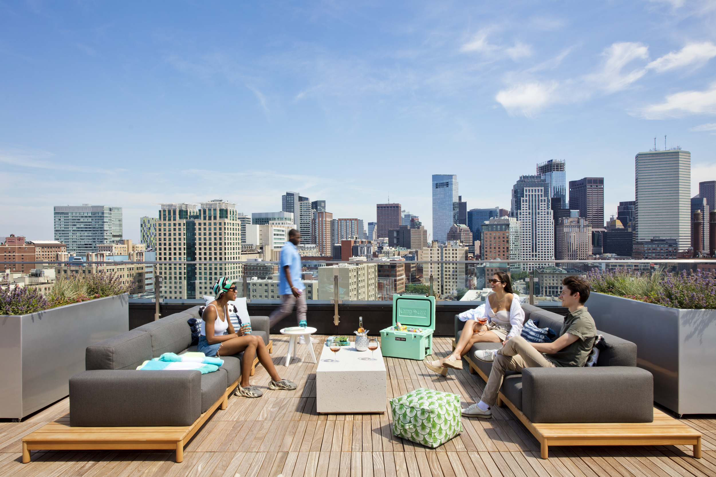 7INK, the seventh and final building at Ink Block, opened in April 2022.  This 148,580 SF, 15-story high-rise includes a mix of traditional apartments, studios and shared suites with individual bedrooms but common kitchen and baths. All 352 rental units come fully furnished including TVs, include all utilities and streaming services, and kitchens & baths in all 180 apartments receive complimentary bi-weekly cleaning. The Inclusive Living™ experience also provides residents with Wi-Fi and a regular calendar of curated social activities. The building has a large amenity area for co-working and socializing, and a stunning roof top deck overlooking the Boston skyline.