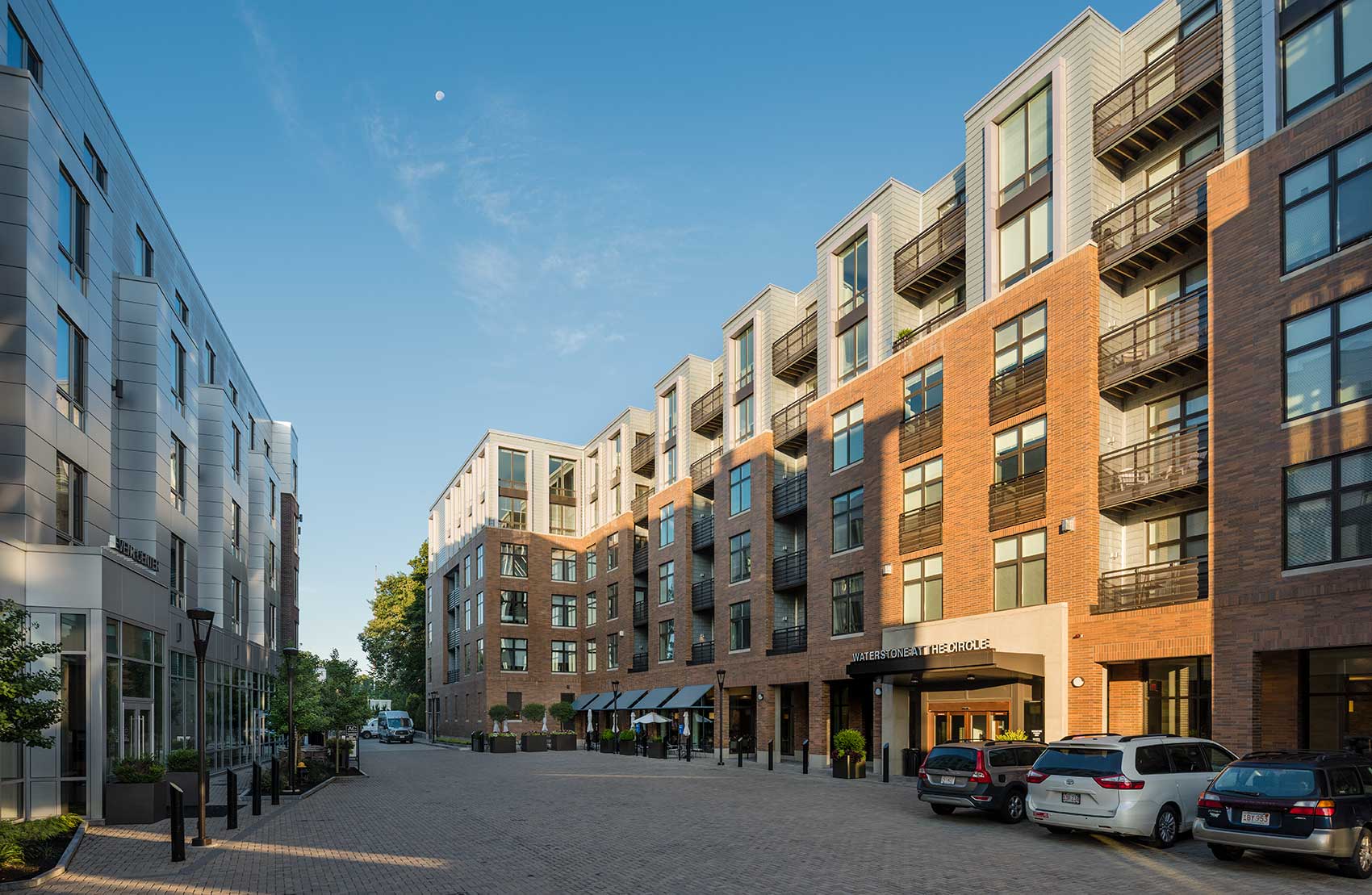 Located on the site of the former Circle Cinema at the intersection of Beacon Street and Chestnut Hill Avenue in Boston, The Circle is a mixed-use project composed of a 162-room AC Marriott Hotel and a 92-unit, high-end, independent residential community called Waterstone at The Circle. Two restaurants at the base of the buildings engage Chestnut Hill Avenue and bring ground floor activity to the site. The layout of the development is centered on a piazza-like courtyard between the two buildings on top of underground parking for 188 cars. The project involved extensive site work and coordination with the MBTA due to proximity to rail lines.