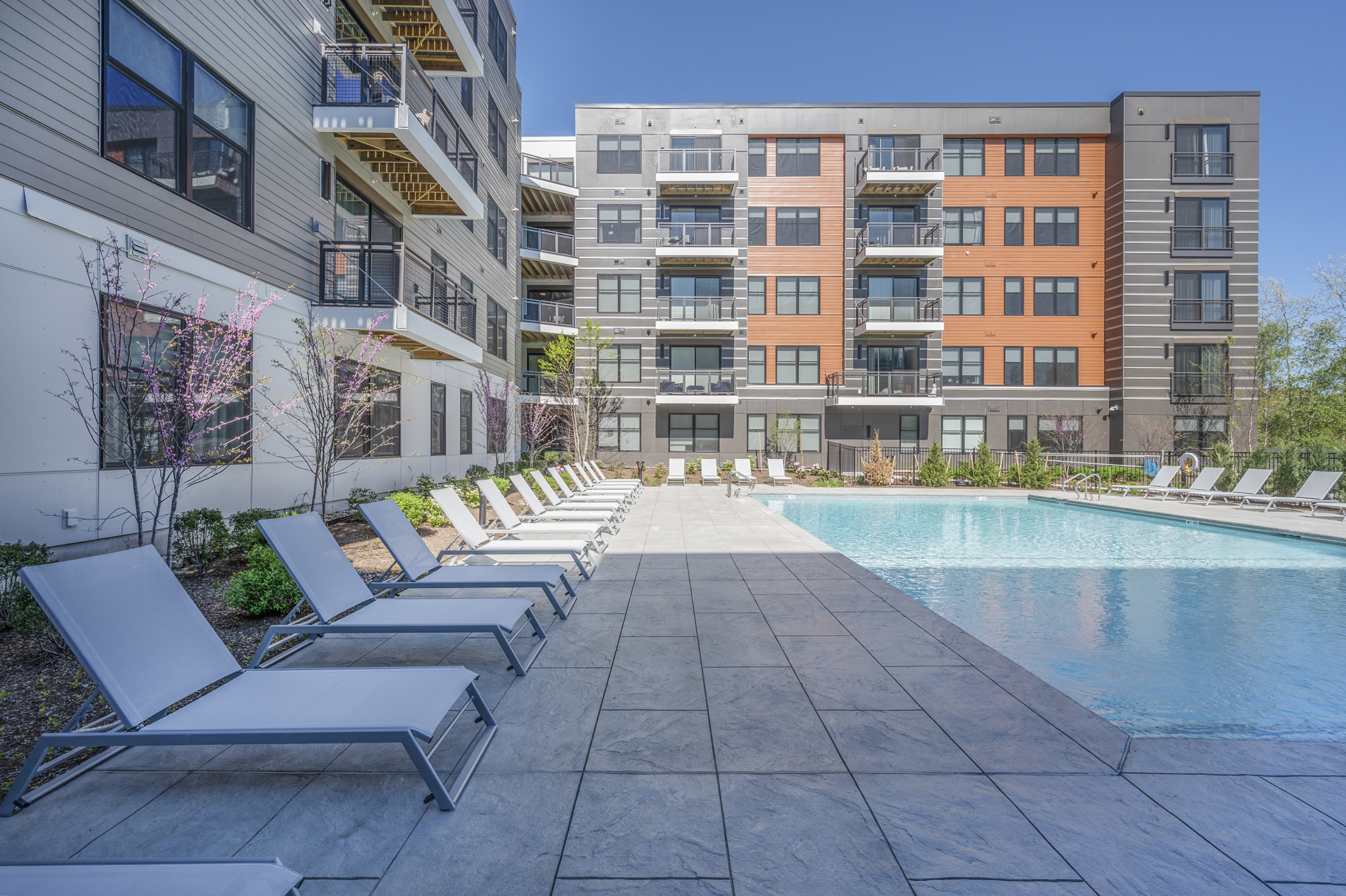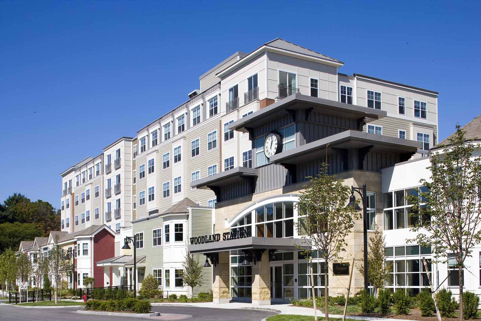 This 40B residential community is located at the Woodland Station MBTA stop on Washington Street in Newton, Mass. The project includes 180 residential units, featuring one, two and three-bedroom townhomes and flats, and a 550-car parking garage. This project involved a public/private partnership with the MBTA to complete the State’s first major redevelopment of an MBTA parking lot. Woodland Station Apartments is adjacent to Newton-Wellesley Hospital, Brae Burn Country Club and Woodland Country Club. The development provides Newton with a national model for Transit-Oriented Development. Drawing on New Urbanism design concepts, the site features a main street parallel to the MBTA’s Green Line that is lined with townhomes with attractive front yard gardens.